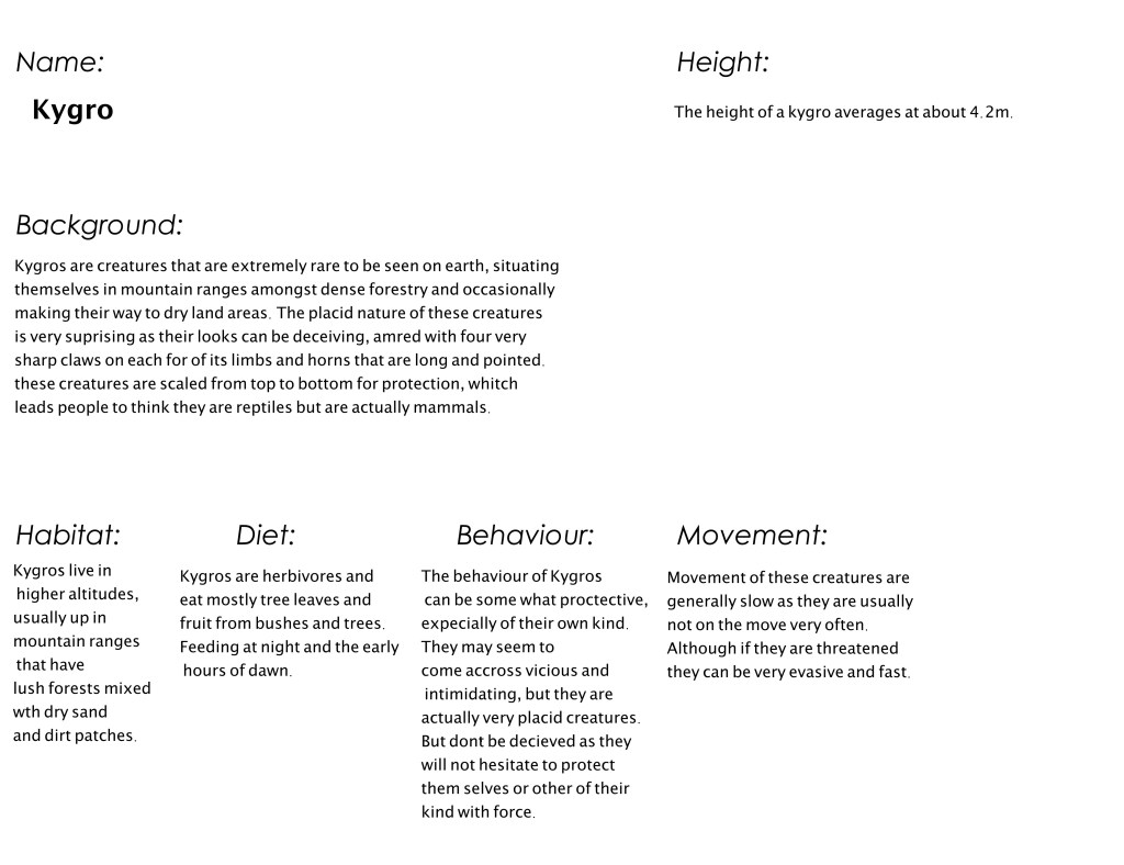 After getting a feel for the creature and visually seeing the way it was coming together, I decided to name the creature Kygro. Then I had a brief overall description of my creature including its habitat, behaviours etc.